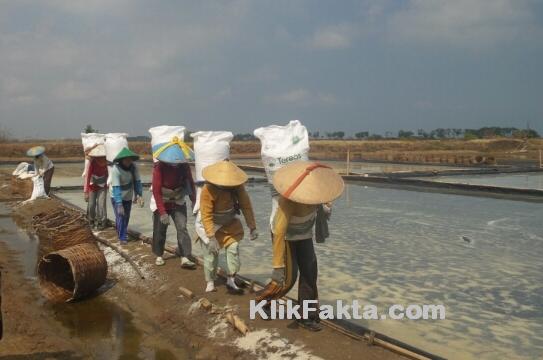 Sejumlah petani tambak garam di Kecamatan Kedung Kabupaten Jepara, Jawa Tengah membawa garam usai panen. [KlikFakta.com/013] |