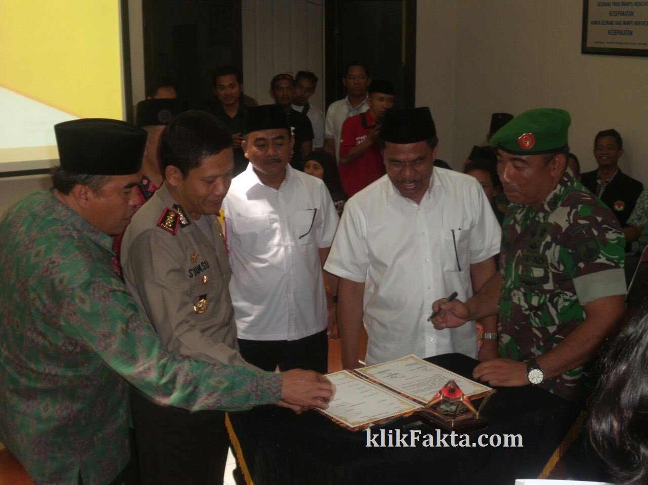 Kapolres Jepara ikut menandatangani naskah deklarasi damai bersama pasangan calon Bupati dan Dandim 0719 Jepara. [klikFakta.com/034]