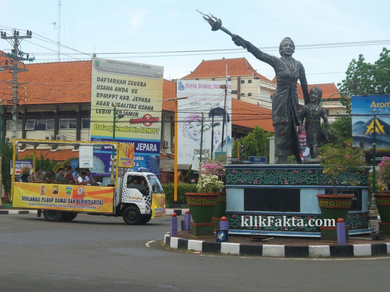 panggung keliling membawa pasangan calon Bupati Jepara didampingi Kapolres Jepara dan Dandim 0719 Jepara melintas di tugu Kartini Jepara. [klikFakta.com/034]