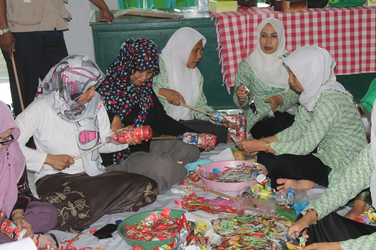 Fitria juga menjelaskan, Ecobrick dibuat dengan cara memasukan plastik-plastik bekas kedalam botol bekas hingga padat dan botol menjadi keras. “kami menggunakan material ramah lingkungan dengan memasukkan dan memadatkan sampah plastik yang sudah bersih dan kering ke dalam botol plastik. Botol plastik dinilai masih menjadi sebuah wadah yang cukup kokoh, karena sebuah botol plastik berukuran 600 mililiter dapat diisi sekitar 250 gram sampah plastik atau setara dengan 2.500 lembar plastik bungkus mi instan, untuk kemudian jadi produk bermanfaat seperti kursi taman, dingklik dan lainnya,” urai Fitria sambil membuat 1 buah ecobrick.