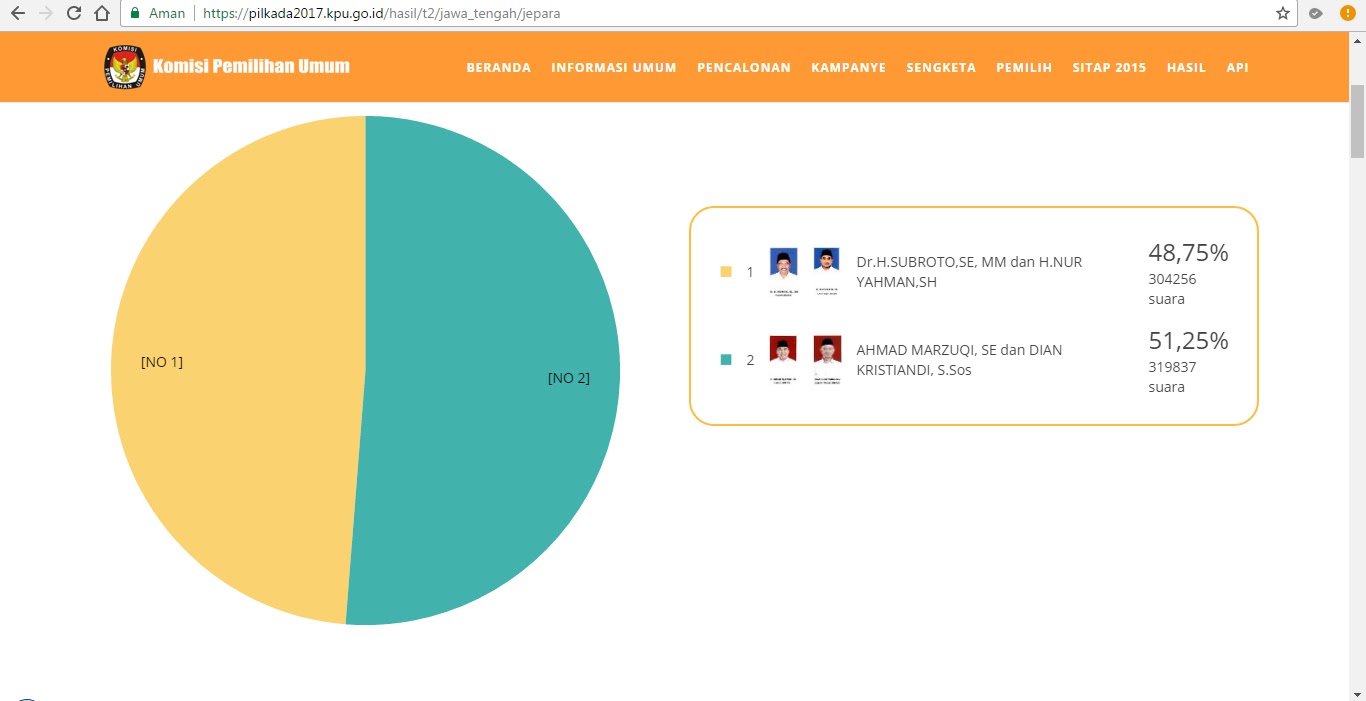 klikFakta.com, JEPARA — Sempat beredar hitungan perolehan suara dengan cepat di berbagai media sosial dengan hasil yang berbeda-beda. Akhirnya hitung cepat versi Komisi Pemilihan Umum (KPU) sudah keluar dan data yang masuk sudah penuh 100 %. Versi KPU yang dipublikasikan melalui website resmi kpu.go.id perolehan suara dimenangkan oleh pasangan calon nomor urut dua yakni Ahmad Marzuqi – Dian Kristiandi (Madani).