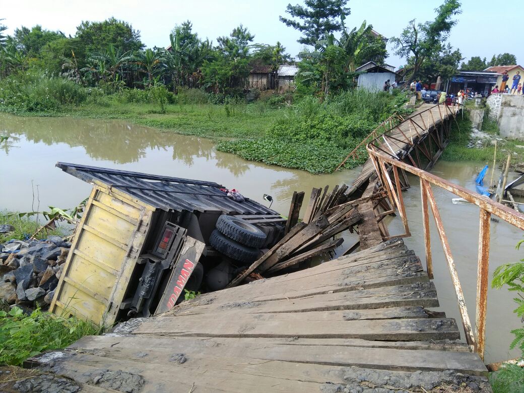 klikFakta.com, JEPARA – Tak kuasa menahan beban kendaraan truk yang mengangkut batu, jembatan Serang yang menghubungkan wilayah Kabupaten Jepara dengan Kabupaten Demak, Jawa Tengah ambrol. Akibatnya, truk yang kendarai Anas warga RT 01 RW 04 Desa Bungo Kecamatan Wedung, Demak terperosok dan masuk ke dalam sungai.