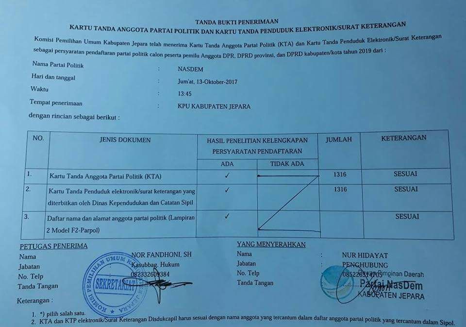 Pengurus DPD NasDem Jepara, Nur Hidayat menambahkan, semua persyaratan pendaftaran sudah disampaikan kepada KPUD Jepara. Hasilnya memang sudah terpenuhi dan dinyatakan lengkap.