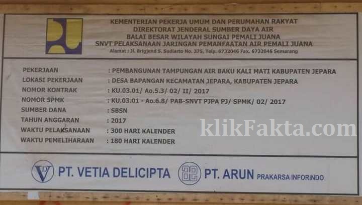Megaproyek dengan judul pekerjaan pembangunan tampungan air baku kali mati Kabupaten Jepara, dengan nomor kontrak KU.03.01/Ao.5.3/02/II/2017 tersebut di mulai pada awal tahun 2017 dengan target penyelesaian di akhir tahun 2017.