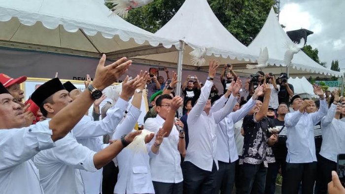 | Lima paslon Bupati Kudus tengah melepas burung merpati di alun-alun Kudus baru-baru ini, sebagai tanda kampanye damai. (KF-089-istimewa) |