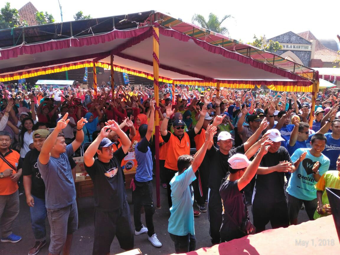 klikFakta.com, JEPARA – Ribuan pekerja di wilayah Kabupaten Jepara memperingati hari buruh atau May Day di alun-alun Jepara, Selasa (1/5/2018). Acara berjalan meriah dengan berbagai kegiatan.