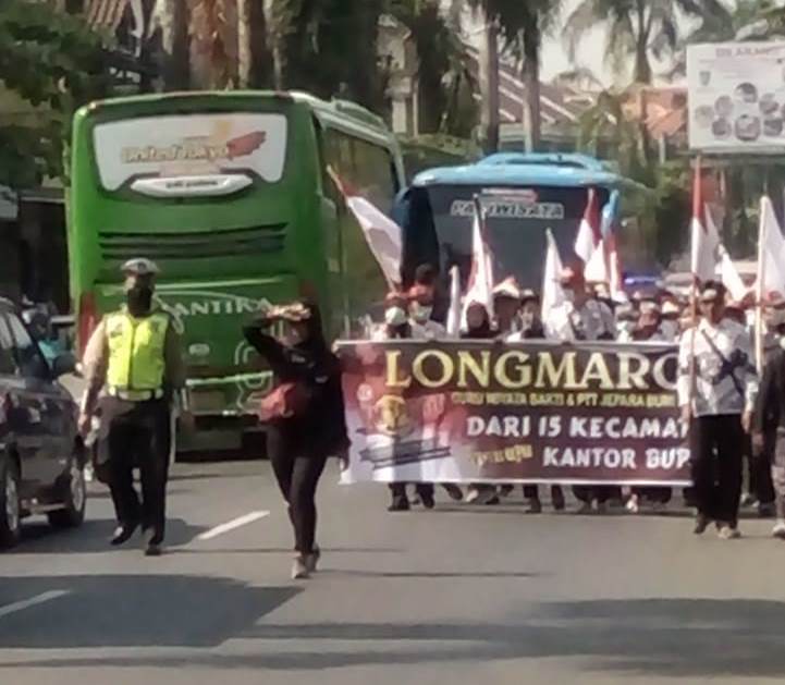 | Sejumlah guru honorer mengikuti aksi jalan kaki puluhan kilometer menuju kantor Bupati Jepara menuntut hak mereka. (KF/dcoc.) |
