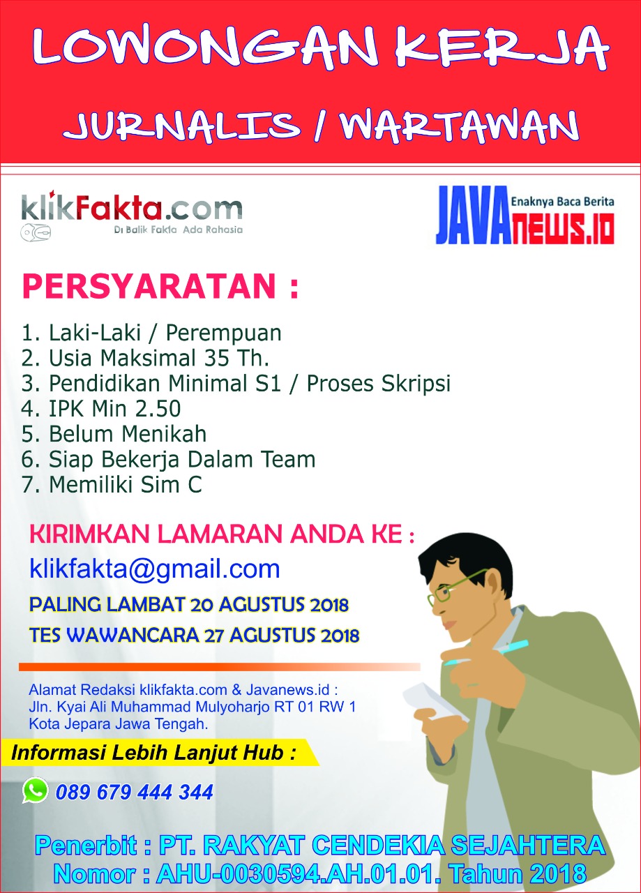 klikFakta.com & Javanews.id Buka Lowongan Kerja Wartawan Redaksi 10/08/2018 ekonomi 488 views Share: Ganjar Minta Pemdes Blak-blakan Soal Dana Desa ke Rakyat Sambut HUT RI, Warga Bawu Kompak Ikuti Jalan Sehat