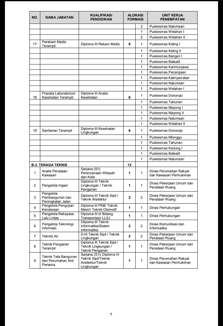 Pada penerimaan CPNS 2018 ini, pemerintah memprioritaskan tiga lowongan utama yakni tenaga pendidikan (guru), tenaga kesehatan, dan tenaga teknis yang mendukung infrastruktur. Prioritas ini juga berlaku di Kabupaten Jepara.