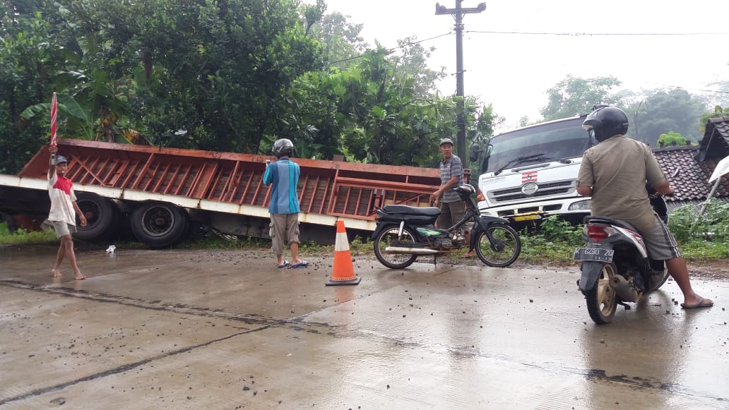 Kondisi jalan yang licin membuat truk kontainer bermuatan crane terperosok di jalan lingkar Mulyoharjo-Ngabul, Rabu (16/1/2019). (KF- Zaenal) |