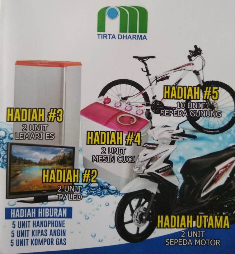Adapun hadiah utama yang diundi berupa dua sepeda motor, dua TV Led 32”, dua buah kulkas, dua mesin cuci, lima sepeda gunung, lima buah HP, lima kipas angin, serta lima buah kompor gas.