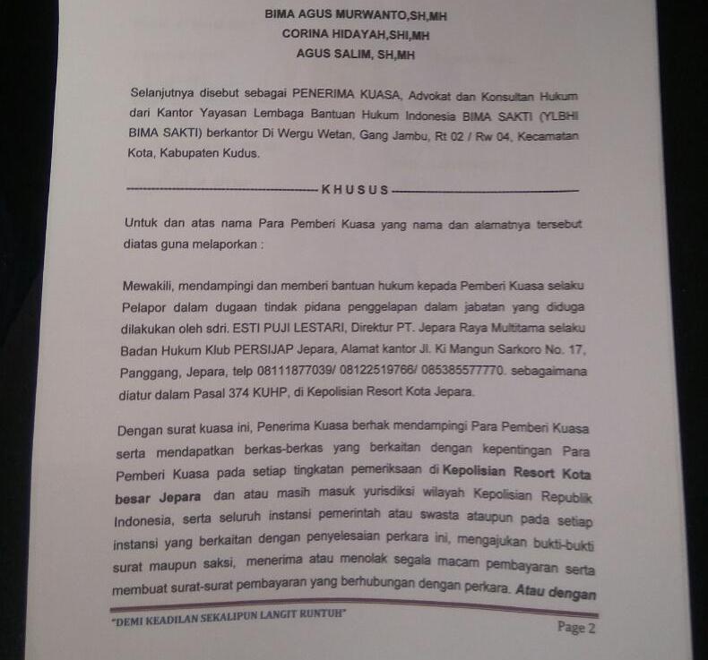 Lampiran surat kuasa LBH yang mendampingi pemain Persijap melaporkan Esti Puji L. (KF-ALI)