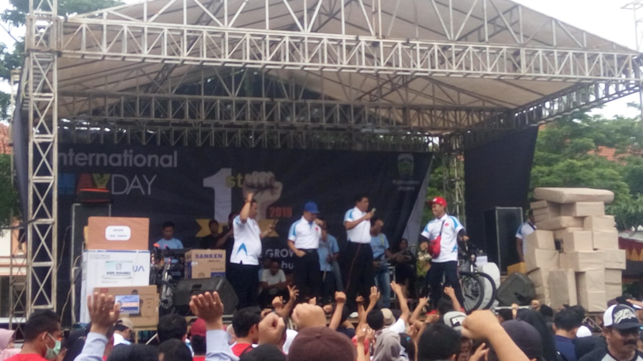 Klikfakta.com, JEPARA – Peringatan hari Buruh Sedunia (Mayday) biasanya di peringati dengan aksi unjuk rasa para buruh untuk menyampaikan aspirasi mereka, namun hal berbeda justru di lakukan sebagian Serikat Buruh di kab. Jepara, pasalnya dalam peringatan hari ini ia dan rekan – rekan buruh melakukan sejumlah kegiatan antara lain Apel, Senam, Jalan Sehat dan pembagian Dorprise untuk peserta.