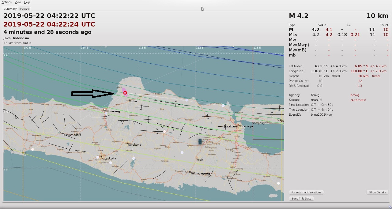 Berdasarkan laporan tim siaga bencana alam dan Badan Metereologi Klimatologi dan Geofisika [BMKG], diketahui bahwa gempa terjadi dengan kekuatan 4.2 SR pukul 11:22:22 WIB dengan lokasi di 6.69 LS,110.78 BT [14 km BaratLaut KUDUS-JATENG], kedalaman hiposenter 10 km.