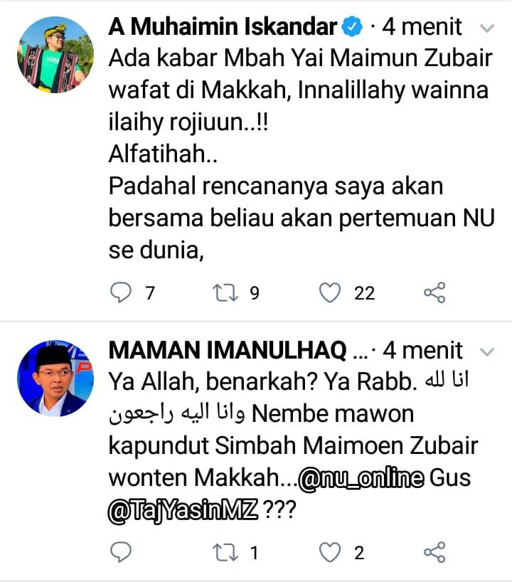 Tokoh-tokoh nasional pun melalui akun media sosialnya menyampaikan belasungkawa dan turut bersedih atas wafatnya Mbah Moen.