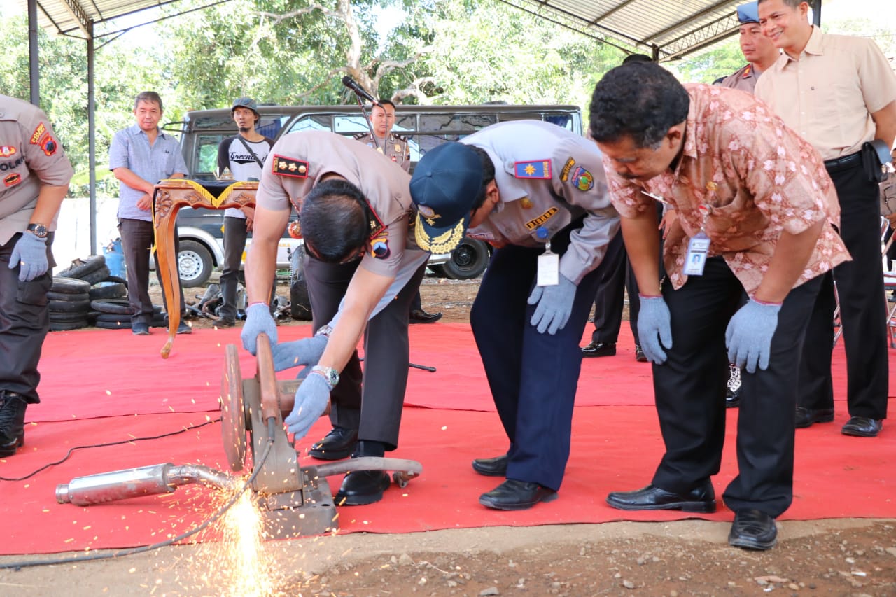 Kapolres Jepara AKBP Arif Budiman memotong knalpot barang bukti Operasi Patuh Candi 2019. (KF-ZQ). |