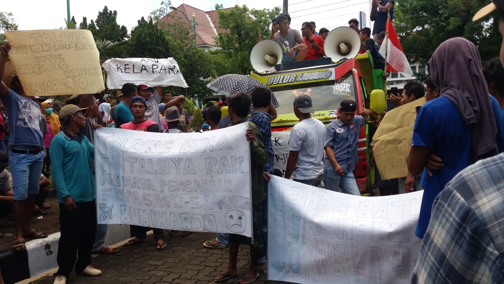 Klikfakta.com, JEPARA – Puluhan supir dump truk dan pekerja tambang Desa Bumi Harjo Kecamatan Donorojo Kabupaten Jepara Rabu (12/02/2020) menggelar demo di depan kantor DPRD Kab. Jepara, Aksi tersebut merupakan buntut dari Penutupan jalan menuju lokasi tambang galian C kali gelis Bumi Harjo yang dilakukan oleh Forkopimda kabupaten Jepara.