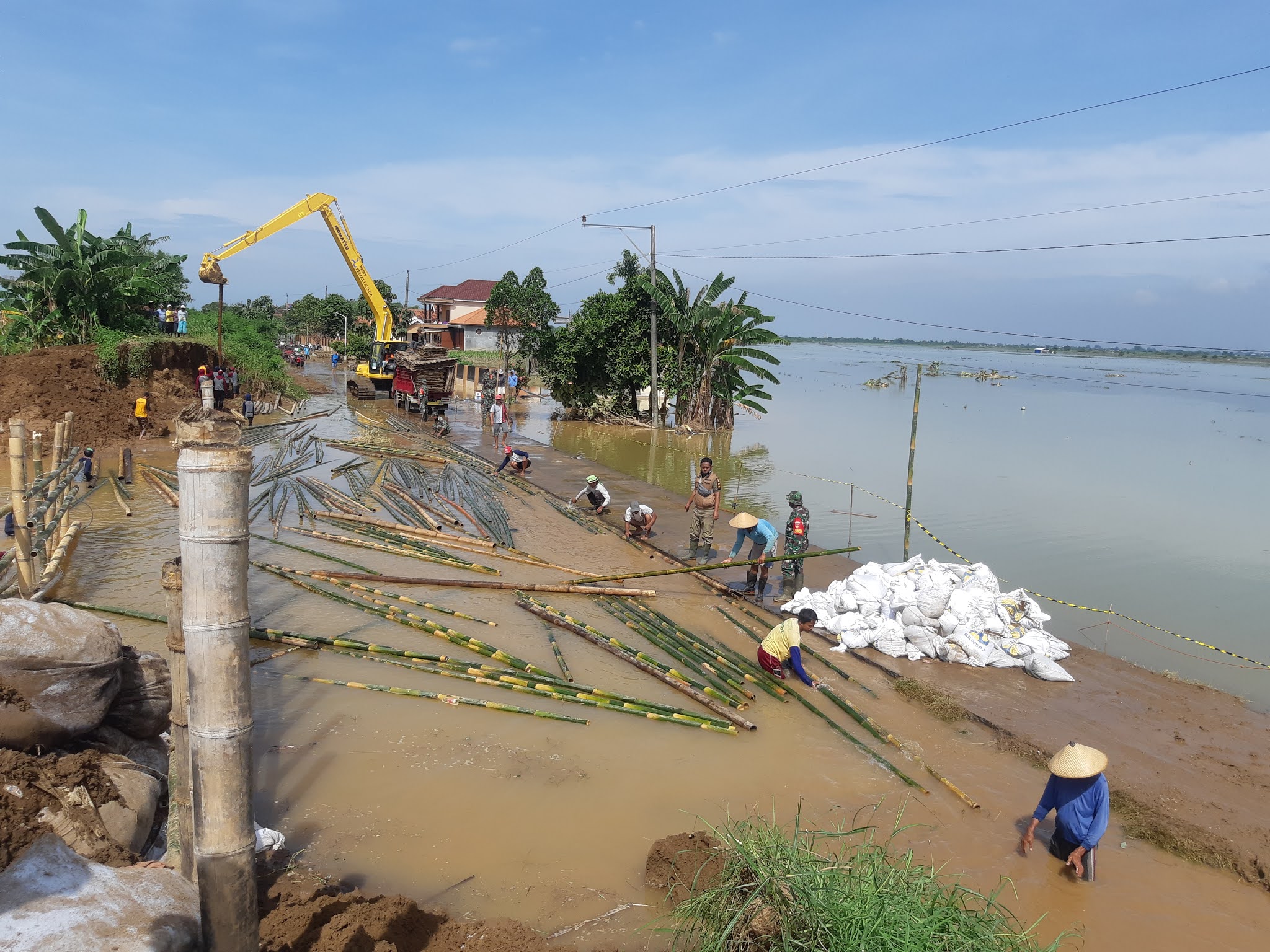 | Caption : Pembangunan tanggul darurat melibatkan warga dan relawan dari berbagai organisasi (KF-SR). |