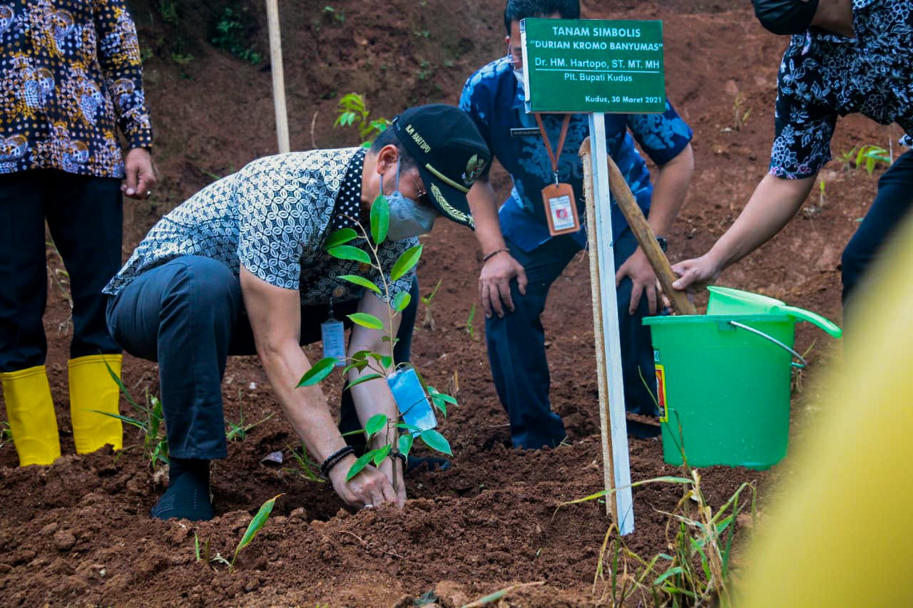 Plt Bupati Kudus HM Hartopo menanam bibit pohon durian unggulan dengan didampingi Kepala Dinas Pertanian dan Pangan Kudus Catur Sulistiyanto (mengenakan batik) (foto:klikfakta.com)