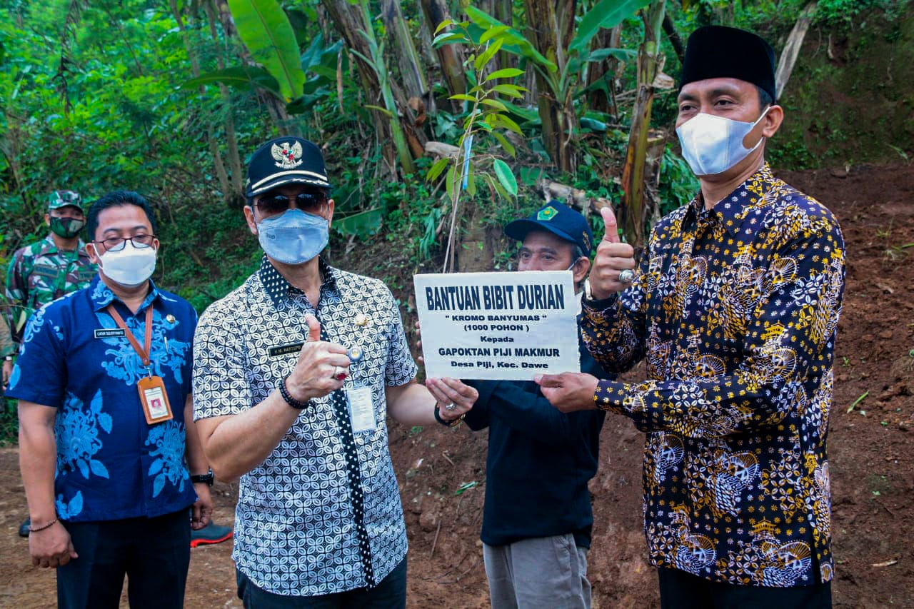 Penyerahan bibit durian varietas “Kromo Banyumas” ini juga didampingi oleh Kepala Dinas Pertanian dan Pangan, serta Camat Dawe. Sekaligus melakukan penanaman secara simbolis bibit buah durian tersebut di kawasan lereng Muria desa Piji.