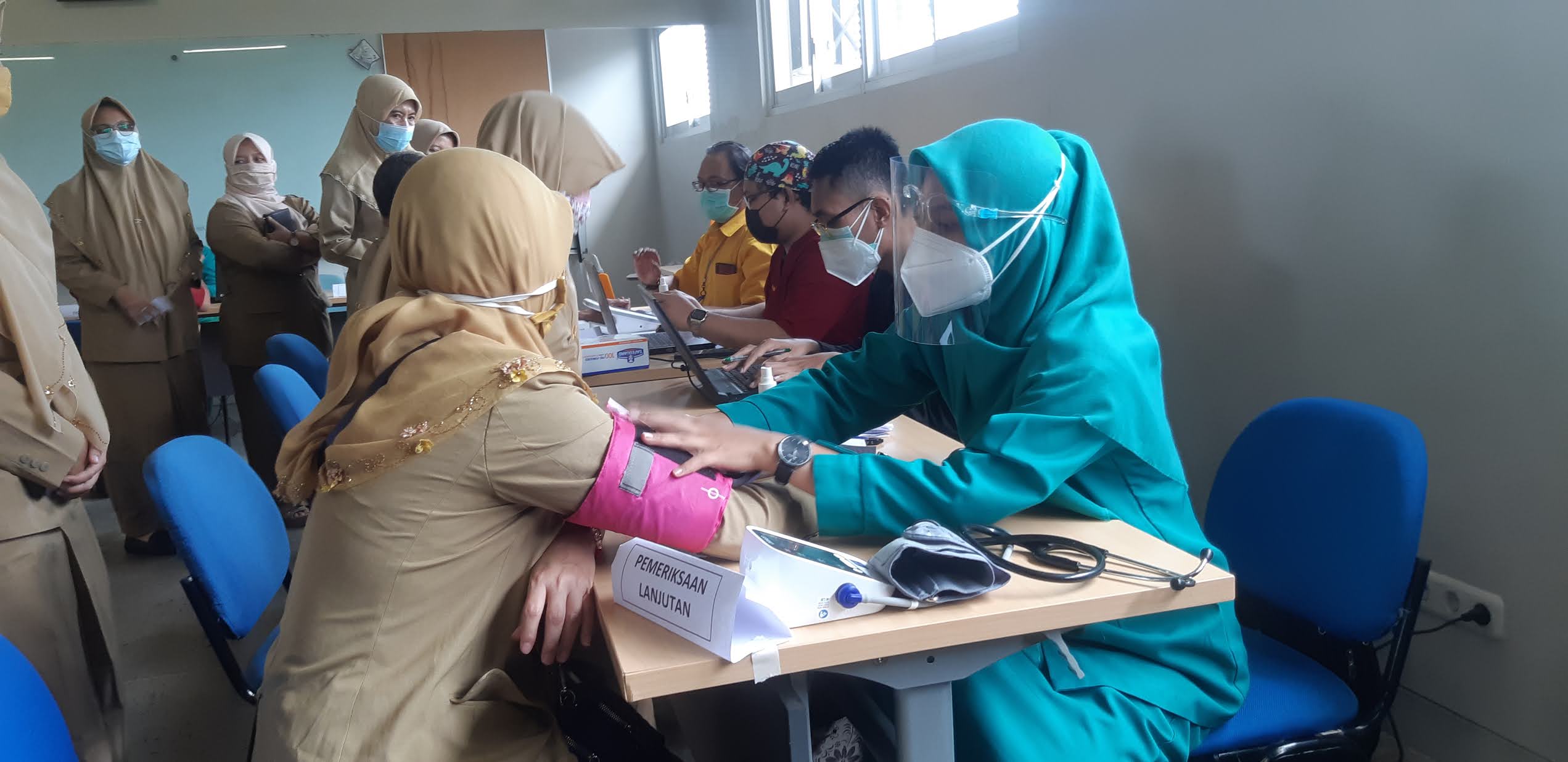 Sebelum di viksinasi sejumlah guru sedang di cek kesehatannya (foto:klikfakta.com) |