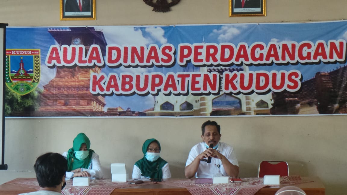 | Kepala Diskominfo Kudus Kholid Seif bersama Kepala Dinas Perdagangan Kabupaten Kudus Sudiharti melakukan jumpa pers di aula Disdagsar, Jumat (26/3) |