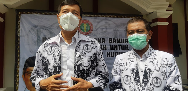 Sekretaris PGRI Jateng Aris Munandar yang memakai masker Putih didampingi Ketua Pengurus PGRI Kabupaten Kudus Ahadi Setiawan (foto:klikFakta.com). |