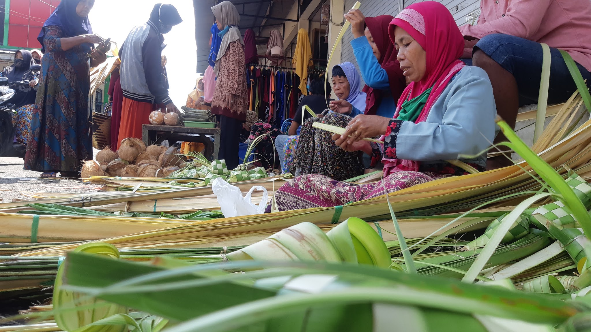 “Janur sa’iket Rp 5-4 ribu, nak lakaran kupat Rp 5 ribu, iku ae ijeh di enyang sing tuku Rp 2 janur, Rp 3 kupat. (Janur satu iket Rp 5-4 ribu, kalau lakaran ketupat Rp 5 ribu, itu saja masih ditawar sama pembeli Rp 2 ribu, Rp 3 kupat),” ucapnya.