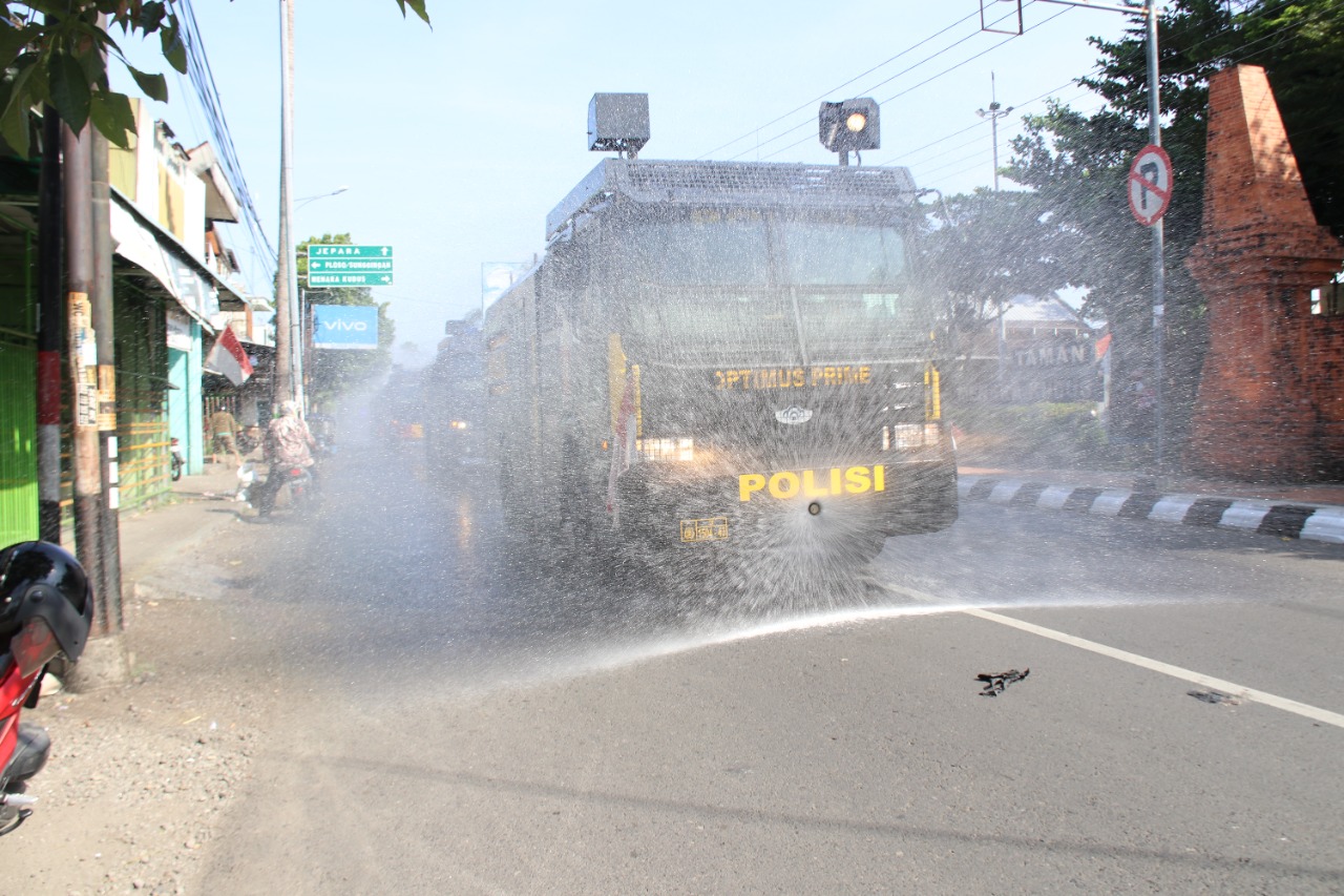 Penyemprotan cairan disinfektan sendiri dilakukan di jalan raya menggunakan Mobil Armoured Water Cannon (AWC) milik Satuan Samapta polres Kudus, Brimob Polda Jateng, Dit Samapta Polda Jateng serta mobil Damkar.