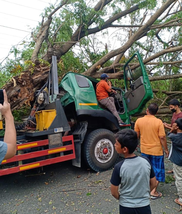 “Saya dari utara, dari arah berlawanan ada motor yang nyalip tronton. Akhirnya menghindar dan terlalu ke kiri sampai box kontainer belakang kiri kena pohon. Setelah itu pohon yang rubuh menimpa kabin depan bagian tengah, ” ucapnya saat ditemui di lokasi kejadian.
