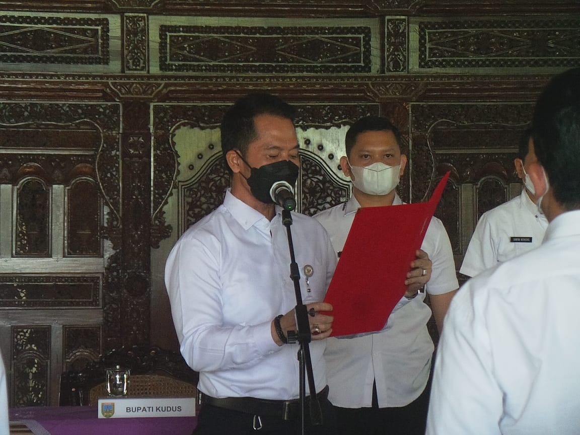KlikFakta.com, KUDUS – Dua puluh sembilan pejabat mulai dari eselon II hingga eselon III di Kudus hari ini di lantik dan dirotasi oleh Bupati Kudus HM Hartopo, Kamis (1/7/2021).