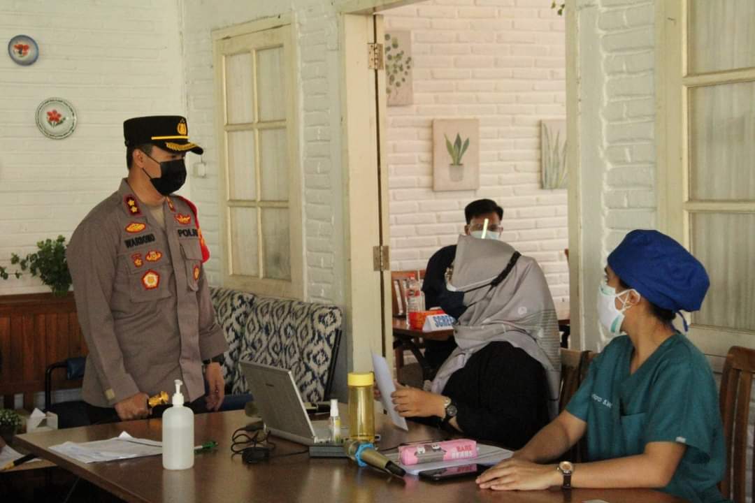KlikFakta.com, Jepara – Kapolres Jepara AKBP Warsono, melaksanakan peninjauan pelaksanaan Gerai Vaksinasi Presisi di D’Anglo Jepara, Senin (05/07/21).