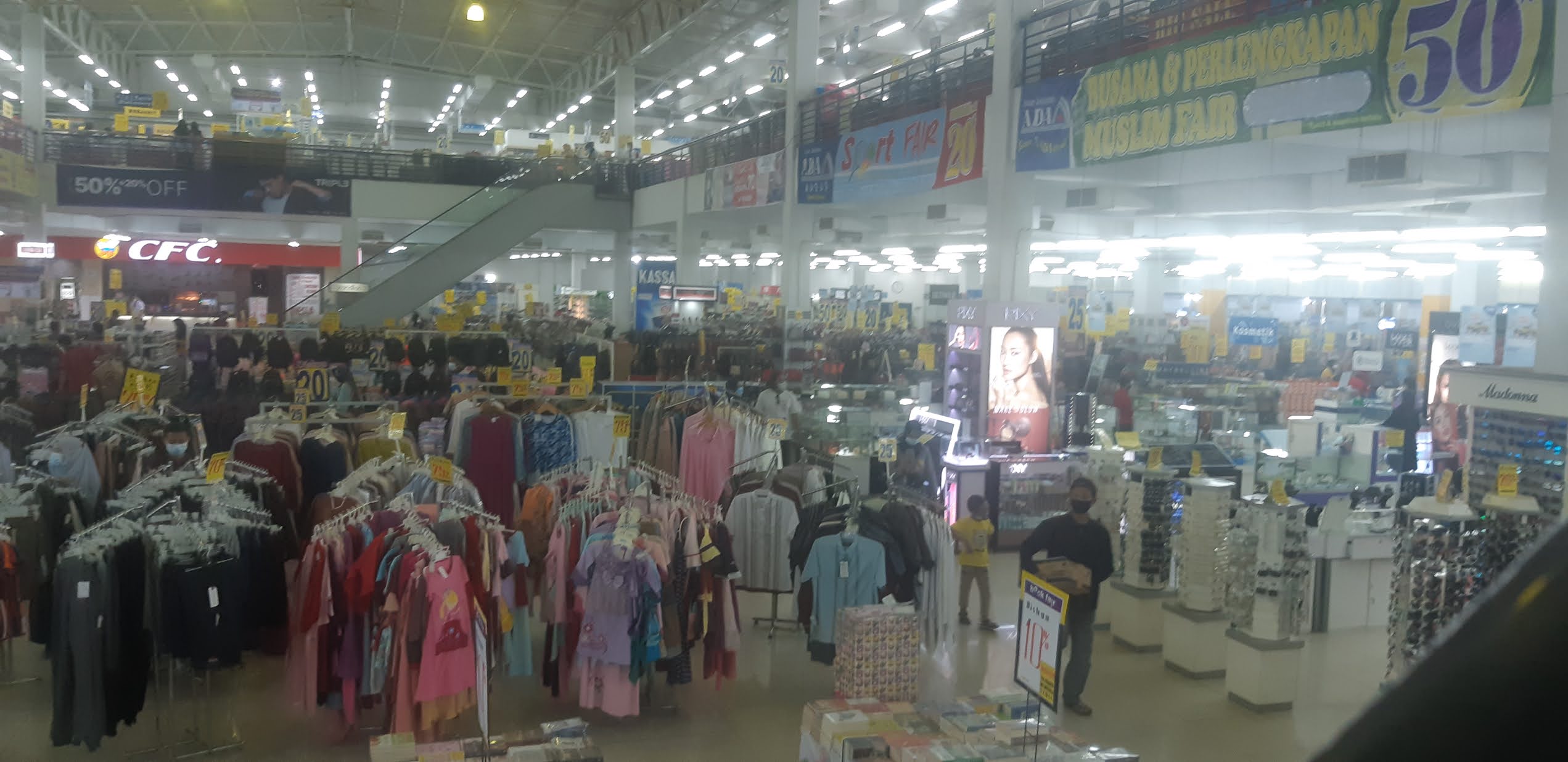 Ketika memasuki swalayan, masih banyak pakaian, sepatu, dan lainnya yang diperjual belikan. Begitupun di area supermarket, semuanya masih terlihat sibuk seperti hari biasanya. Hanya saja satgas covid-19 masih sering berkeliling mengingatkan para pengunjung untuk taat protokol kesehatan.