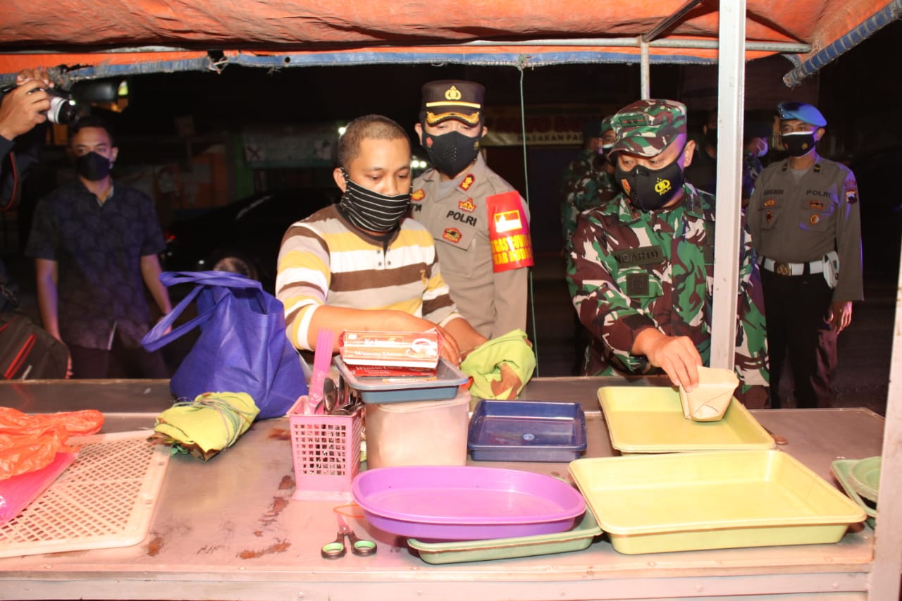 Kapolres dan Dandim mendatangi pedagang makanan yang masih terlihat berjualan di atas pukul 20.00 WIB, ia terlihat mengobrol dengan seorang pedagang nasi bungkus supaya mematuhi aturan PPKM Darurat.