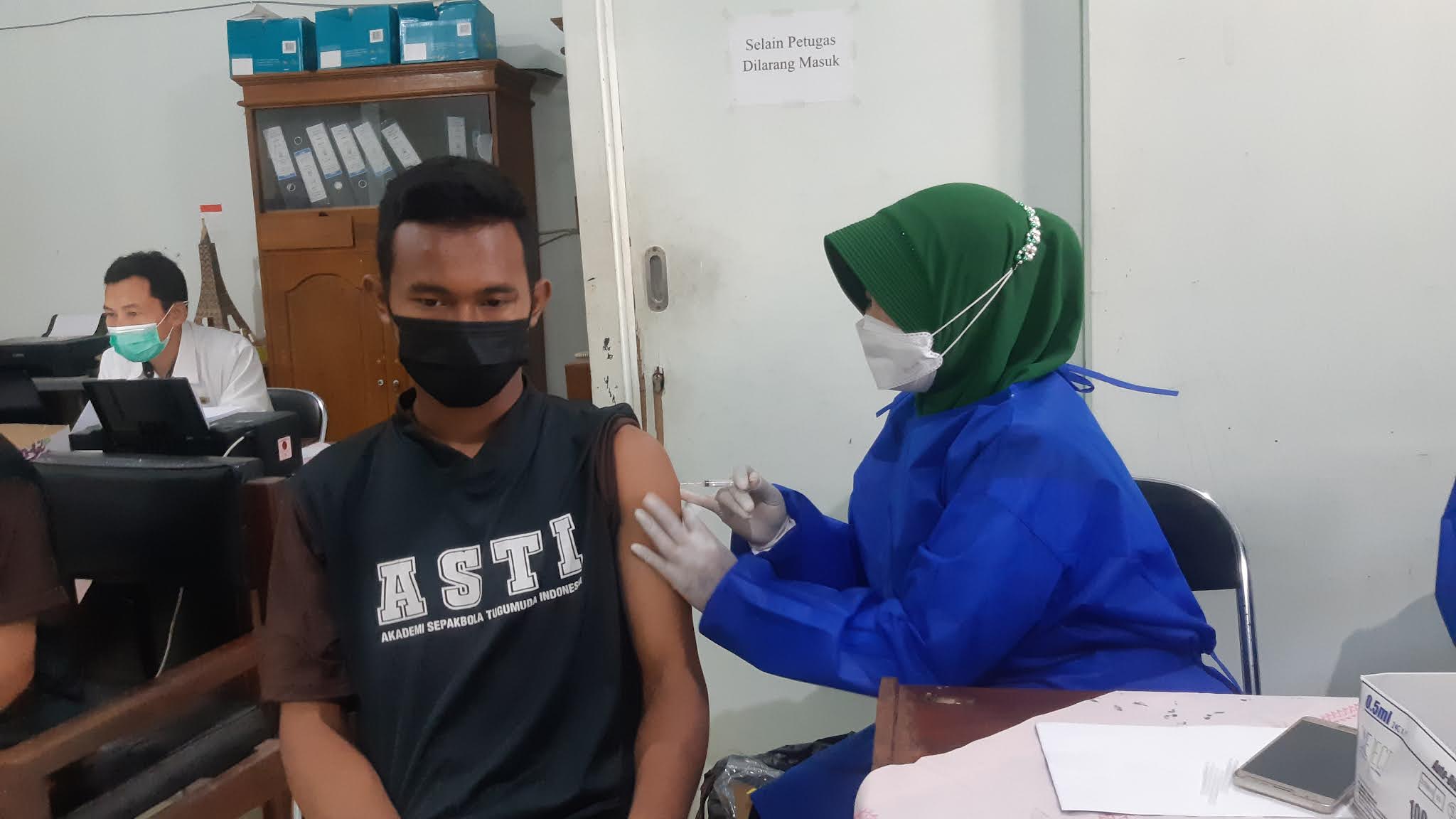 | Pemain ASTI tengah disuntik vaksin dosis pertama (foto : ra) |