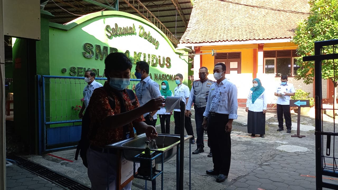 “PTM terbatas akan dimulai minggu depan, tapi harus betul-betul menerapkan protokol kesehatan dengan ketat. Makanya untuk saat ini, kami keliling untuk memberikan petunjuk terkait masalah SOP yang benar dalam pemberlakuan PTM terbatas,” jelas Hartopo, saat ditemui awak media di SMP 4 Kudus, Jumat (27/8/2021).