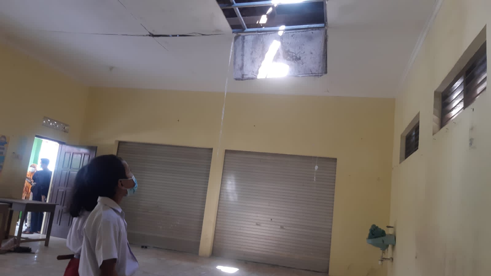 Dari pantauan yang dilakukan, terlihat atap dua ruangan tersebut ambrol. Ceceran genteng pun berserakan di lantai ruangan. Untuk mencegak kerusakan makin parah, atap dua ruangan tersebut disangga dengan sebuah bambu.