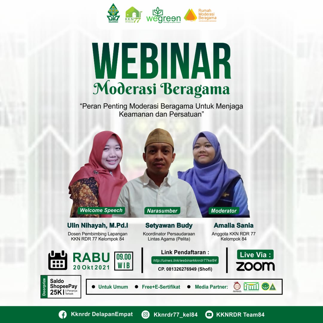 “Acara webinar moderasi beragama ini sangat menarik untuk dilaksanakan, karena menambah wawasan kita mengenai moderasi beragama di negara kita yang banyak suku dan ras nya. Saya harap dengan acara ini kita semua lebih mengerti pentingnya rasa toleransi”. Kata Shofi Fadhillah, Koordinator Kelompok 84 KKN RDR 77 UIN Walisongo.