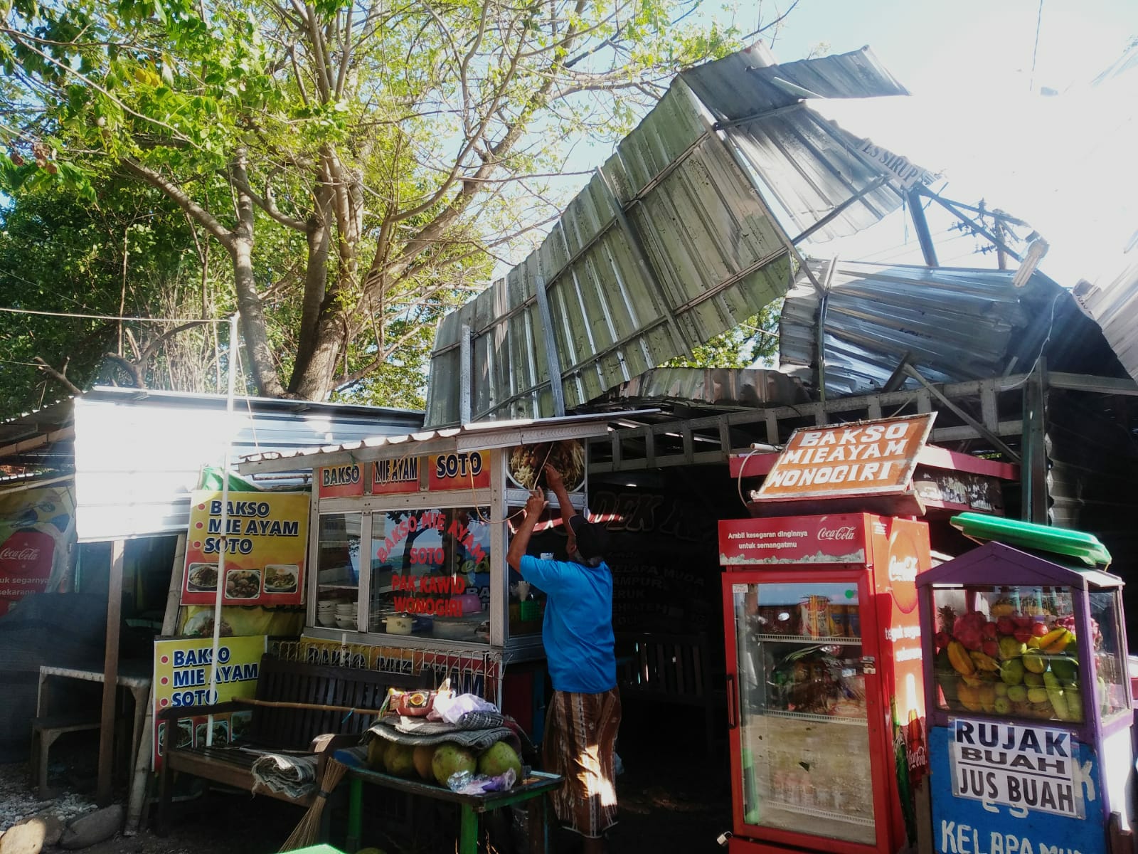 “Kejadian habis magrib mas. Saat itu saya masih di rumah kebetulan dekat dengan kios. Lalu dikasih tau tetangga bahwa pohon di depan kios saya roboh,” kata dia.