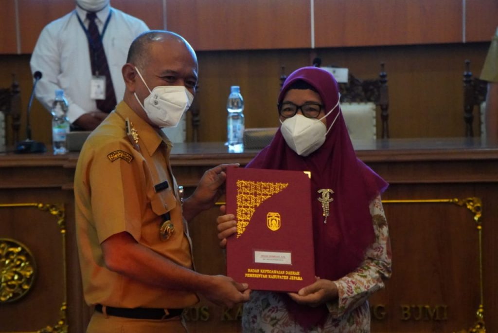 KlikFakta.com, Jepara – Bupati Jepara Dian Kristiandi menyerahkan surat keputusan (SK) pensiun kepada 29 PNS yang purna tugas per 1 November 2021. Penyerahan dilakukan di Gedung Shima Setda Jepara, Senin (8/11/2021). Turut hadir dalam penyerahan ini Sekda Jepara Edy Sujatmiko, Kepala BKD Jepara Oni Sulistijawan, pimpinan OPD terkait dan perwakilan Bank Jateng.