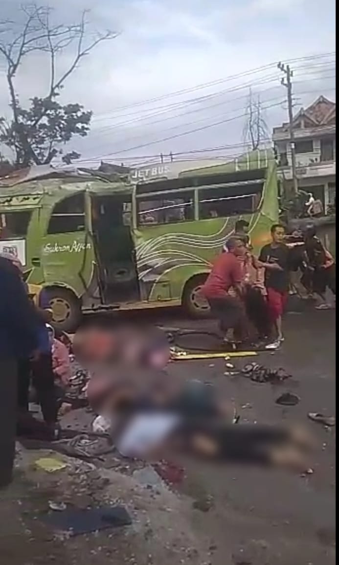 Dari penuturan saksi mata, warga setempat, Kaliman (52) bus itu menabrak median jalan hingga terguling-guling.