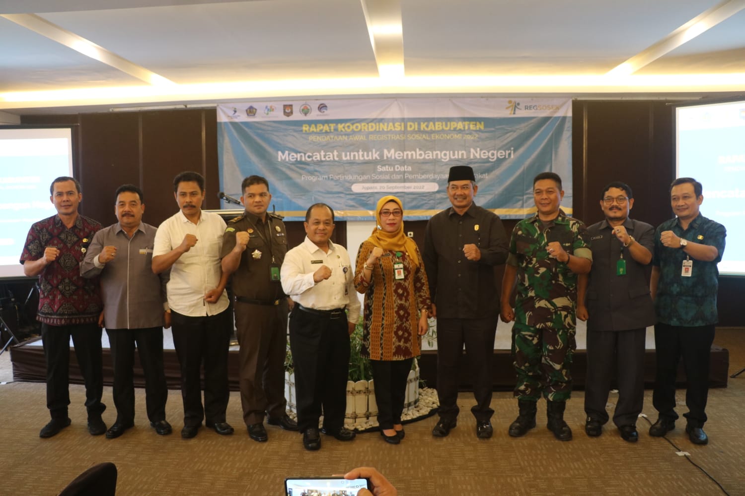 Rakor pendataan awal Regsosek 2022 dengan tema Mencatat Untuk Membangun Negeri, Satu Data Program Perlindungan Sosial dan Pemberdayaan Masyarakat juga dihadiri Wakil Ketua DPRD Pratikno, Kepala Bappeda Subiyanto, Kepala Diskop, UKM, Nakertrans Samiadji, Kepala Diskominfo Jepara Arif Darmawan, dan perwakilan perangkat daerah.