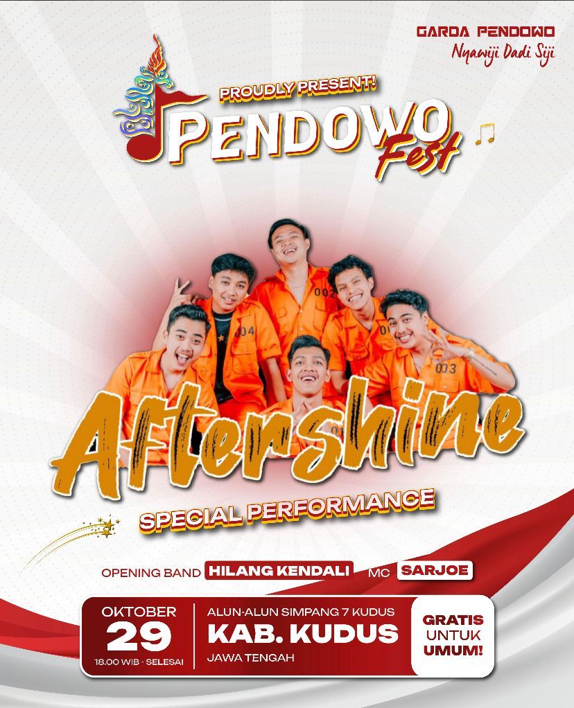 KlikFakta.com, KUDUS – Pendowo Fest akan digelar pada Minggu, 29 Oktober 2023 di Alun-alun Simpang Tujuh Kudus. Terdapat bintang tamu ‘Aftershine’ yang akan memeriahkan acara tersebut dan juga band lokal ‘Hilang Kendali’ yang akan ditampilkan secara gratis untuk seluruh elemen masyarakat.
