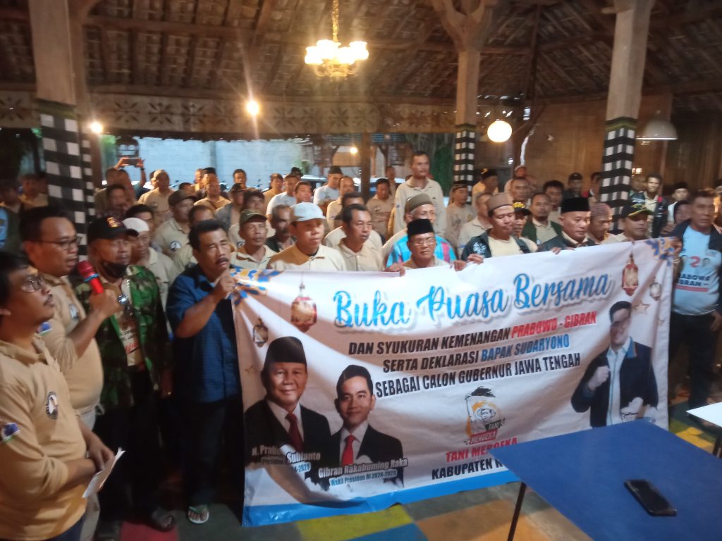 KlikFakta.com, KUDUS – Kelompok Tani Merdeka kabupaten Kudus mengadakan buka puasa bersama dan syukuran atas kemenangan Prabowo Subianto sebagai Presiden dan Gibran Rakabuming Raka sebagai Wakil Presiden Republik Indonesia periode 2024-2029 serta deklarasi dukungan kemenangan Sudaryono sebagai calon Gubernur Jawa Tengah.