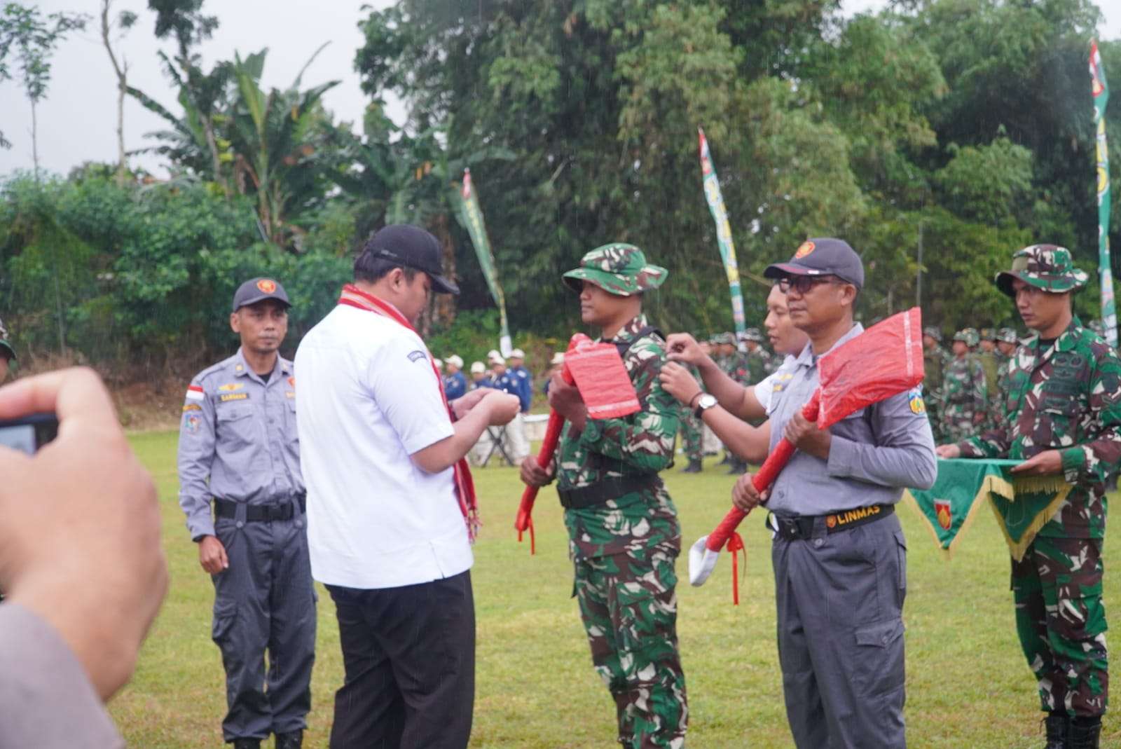 Penanganan darurat untuk tanah longsor dilakukan dengan menutup tanah sekitar dengan plastik guna mencegah longsor susulan.