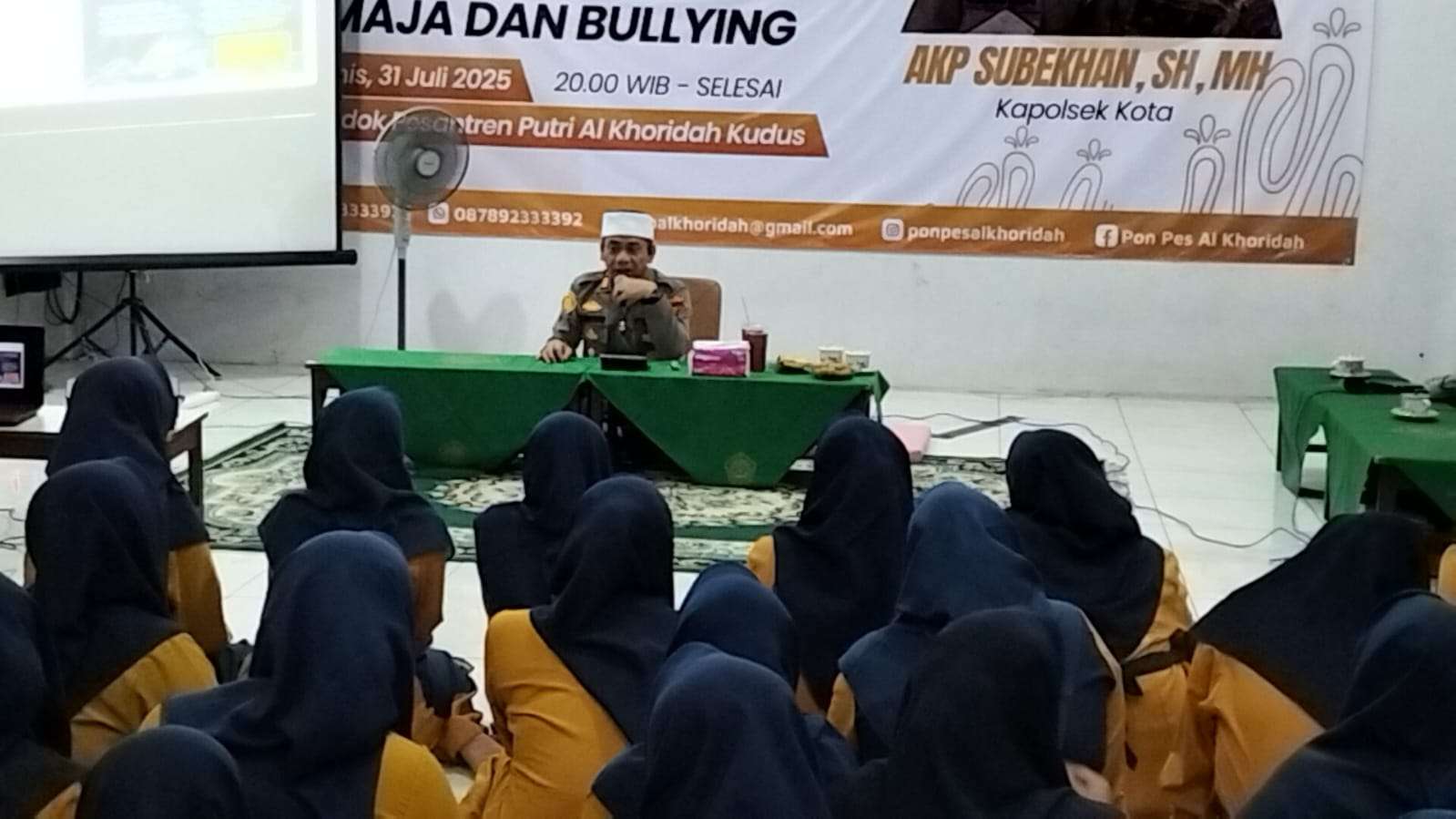 KlikFakta.com, KUDUS – Sebanyak 78 santri Pondok Pesantren Putri Al Khoridah mendapat sosialisask langsung soal bahaya kenakalan remaja dan media sosial langsung dari Kapolsek Kudus Kota AKP Subkhan.