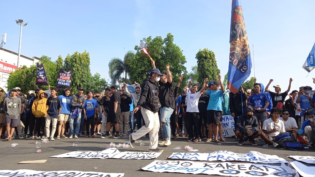 Ratusa suporter Persiku Kudus yang tergabung dalam Suporter Macan Muria (SMM) melakukan ujuk rasa di depan kantor Bupati Kudus HM...
