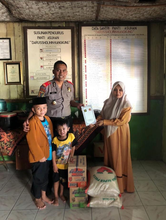 Ringankan beban anak yatim piatu Kompol Eko Rubiyanto memberikan bantuan paket sembako ke panti asuhan.
