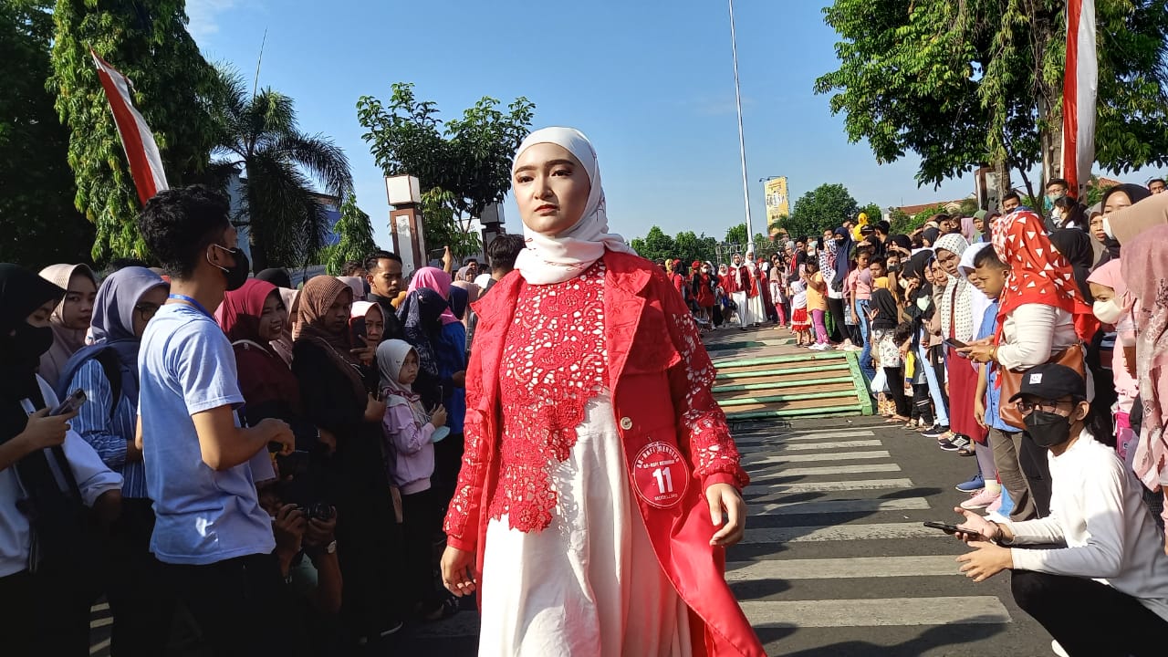 Puluhan peserta beradu busana di jalan zebra cross di dalam acara fashion on the street saat Car Free Day (CFD),...
